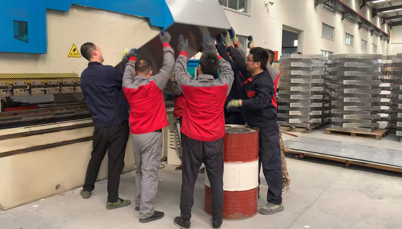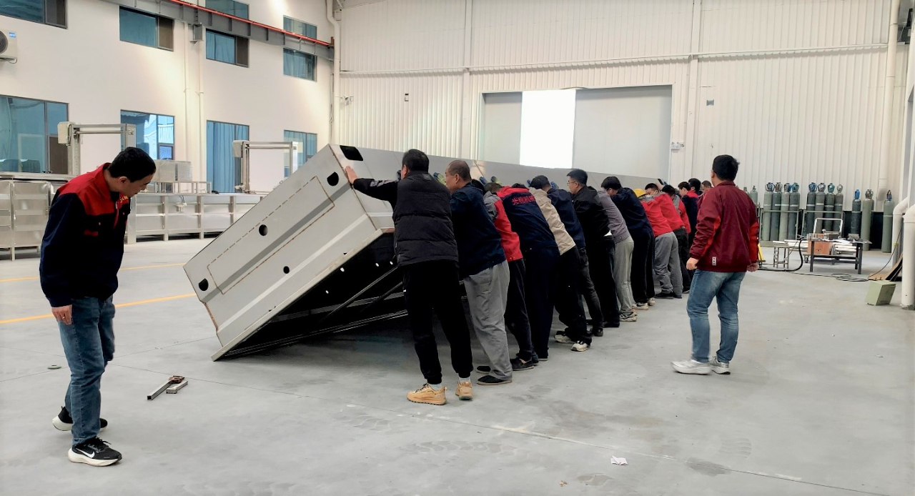 車間里,工廠工人齊心折彎巴氏槽體板,有人扶穩板材精準施力,有人把控器械穩步施壓,面對厚重板材,眾人步調一致,眼神交匯間傳遞默契,于細微之處見齊心。